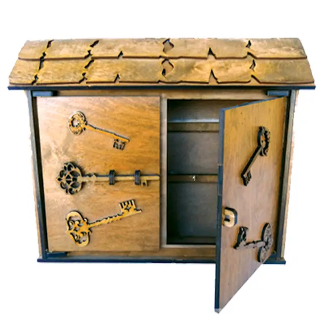 Дерев'яна настінна ключниця виготовлена у формі будиночка. Вона досить містка, усередині є 6 гачків. Всі елементи конструкції вирізані лазером із фанери та покриті безбарвним лаком. Кріплення до стіни здійснюється за допомогою двох кріплень (гачки, шурупи, дюбеля), на які чіпляється ключниця (на тильній стороні виробу є два спеціальні отвори).