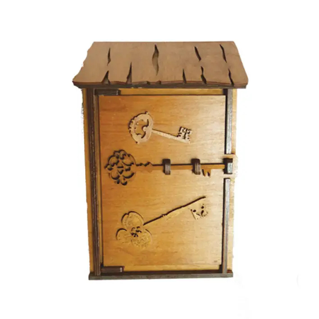 Невелика дерев'яна настінна ключниця виготовлена у формі будиночка. Головною відмітною рисою цієї моделі є її компактність. Вона розрахована на 4 пари ключів. Всі елементи конструкції вирізані лазером із фанери та покриті безбарвним лаком. Кріплення до стіни здійснюється за допомогою двох кріплень (гачки, шурупи, дюбеля), на які чіпляється ключниця (на тильній стороні виробу є два спеціальні отвори).