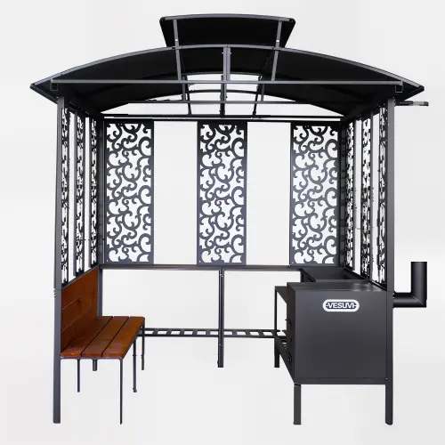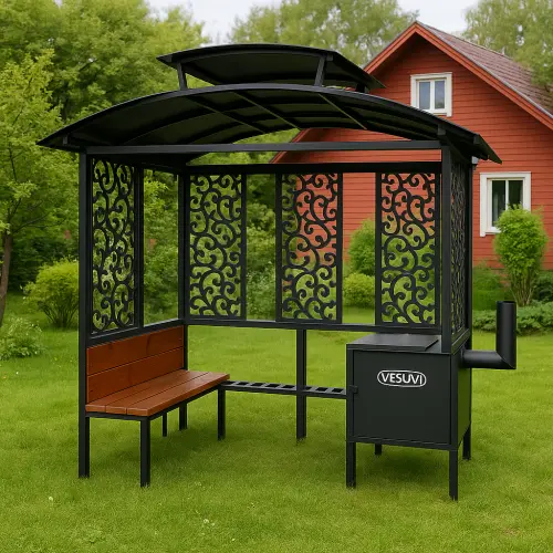 Міцний сталевий мангальний комплекс VESUVI 03 з подвійним дахом, лавкою та барбекю зоною